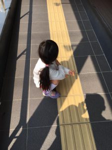 「これ、パパがさっき言っていた点字ブロックだよね。ここで遊んだり、自転車を置いて邪魔したりしたらダメなんだよね。」