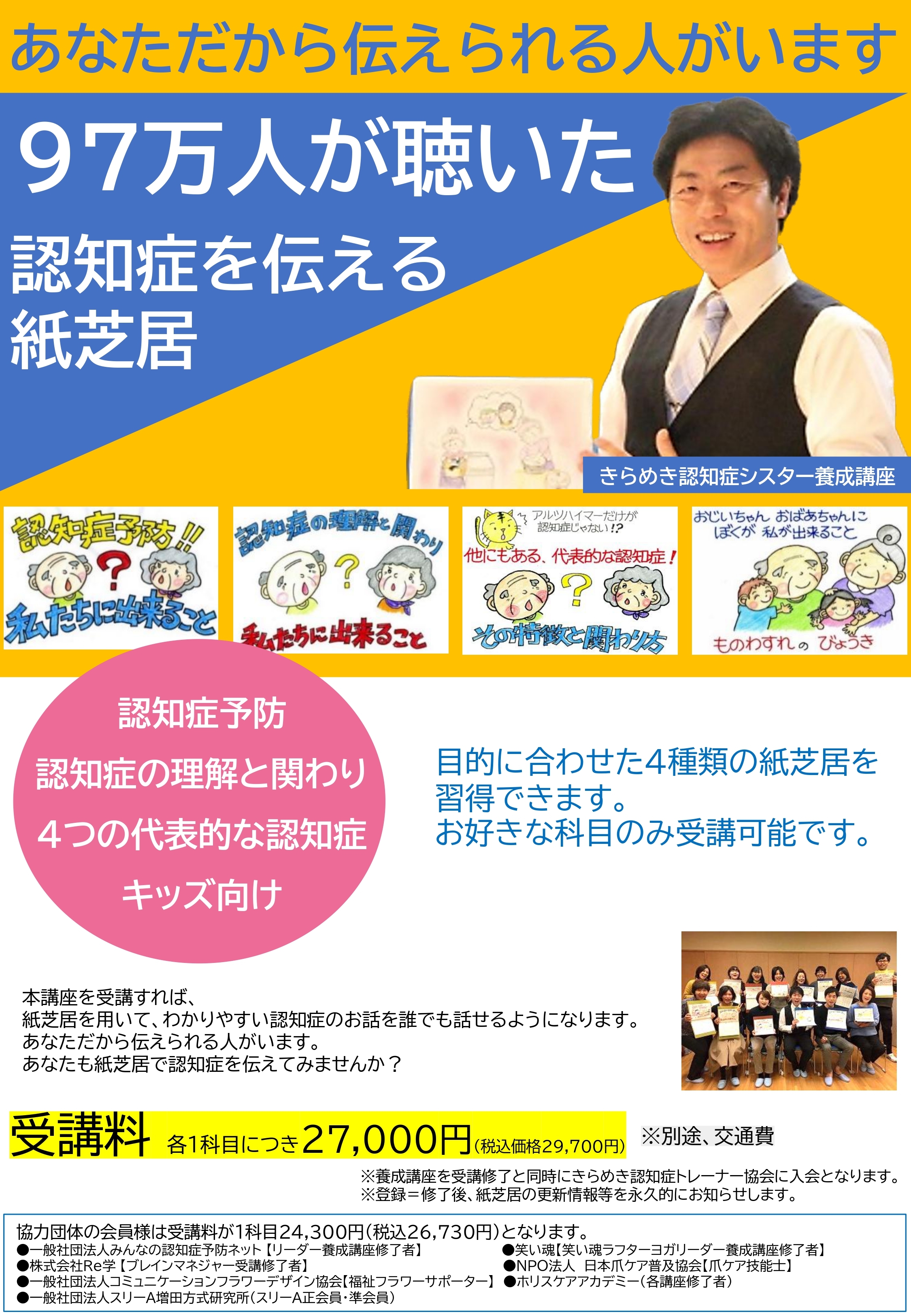 - 養成講座を受講修了と同時にきらめき認知症トレーナー協会に入会となります。